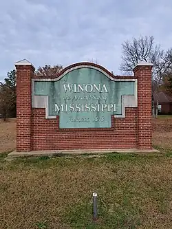 Winona is a city in and the county seat of Montgomery County, Mississippi, United States.[6] The population was 4,505 at the 2020 census,[4] down from 5,043 in 2010. Winona is known in the local area as "The Crossroads"; the intersection of U.S. Interstate 55 and U.S. Highway 51 and 82 run through here.