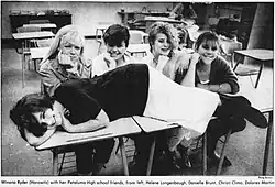 Ryder next starred in the independent film Heathers (1989). The film, a satirical take on teenage life, featured Ryder and Christian Slater as high school sweethearts who begin killing off popular students. Her agent initially begged her to turn the role down, saying the film would "ruin her career".[15] Critical reaction to the film was largely positive,[27] and Ryder's performance was positively received, with The Washington Post calling Ryder "Hollywood's most impressive ingénue […] Ryder […] makes us love her teen-age murderess, a bright, funny girl with a little Bonnie Parker in her. She is the most likable, best-drawn young adult protagonist since the sexual innocent of Gregory's Girl."[28] Despite its critical success, Heathers was a box-office flop, but has achieved the status of a cult film in following decades.[29] However, soon after the film's release, Ryder had an offer to co-star in the 1990 film The Freshman rescinded because the production team was offended by the film's controversial subject matter.[30] Later that year, she starred in the 1989 biopic Great Balls of Fire!, in which she played the 13-year-old bride (and cousin) of rock'n'roll idol Jerry Lee Lewis. The film was a box-office failure and received mixed reviews from critics.[31] Ryder also appeared in 1989 in the music video for Mojo Nixon's "Debbie Gibson Is Pregnant with My Two-Headed Love Child".[32]