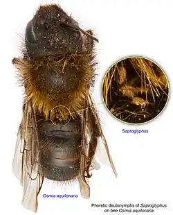 For some specific examples, species of Winterschmidtia and Parawinterschmidtia are associated with beetles living under bark (especially bark beetles), Vespacarus and Kennethiella with eumenine wasps and Vidia with Megachile bees.[2] The genus Psylloglyphus (which is in Oulenziinae[4]) is associated with fleas.[5]