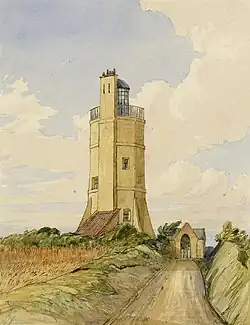 Winterton Lighthouse is located in Winterton-on-Sea in the English county of Norfolk.[1] In 1845 Winterton Ness was described as being 'well known to the mariner as the most fatal headland between Scotland and London'.[2] As well as marking the headland, the lighthouse was intended to help guide vessels into the Cockle Gat, which provided the northern entry into the safe water of Yarmouth Roads.[3] The lighthouse was known to Daniel Defoe and is mentioned in his novel Robinson Crusoe.[4]