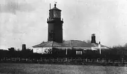 In 1840 a pair of 'neat houses' were erected on the cliff as residences for the keepers;[2] according to several sources the tower was rebuilt at the same time.[23] It was described in 1848 as 'on an eminence south-east of the village […] a lighthouse of late erection, an hexagonal tower seventy feet high, lighted with patent argand lamps and reflectors'.[24] In 1854 the tower was painted red so as to render it more distinctly visible during the day (the adjacent cottages remained painted white).[25]