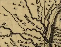 Just prior to the Yamasee War, in 1715, the Winyah people lived in a single village of 106 people.[1] Later that year the Cheraw attempted to pressure the tribe into participating in the war against the English but they refused, instead remaining allies of the colonists.[10] Following the war, in 1716, a number of Winyah moved to the Santee River.[2] However, after two years these Winyah, along with others, joined the Cape Fear Indians who had been driven from their lands in North Carolina, in a move adjacent to a trading post operated by Meredith Hughes at Uaunee, within present-day Georgetown County, South Carolina.[11] The Cape Fear Indians eventually settled inland from Charleston in present-day Williamsburg County, South Carolina.[12]