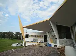 The Wisconsin Pavilion is located at 1201 East Division Street (U.S. Route 10) in Neillsville, Wisconsin, United States.[168][169] The radio stations WCCN AM and FM broadcast out of the pavilion, as does the FM radio station WPKG. The building also houses a gift shop.[160] The modernist–style structure was designed by John Steinmann, an architect from Wisconsin.[4][170] It incorporates pieces of prefabricated steel sheds, which were donated by Pruden Products of Evansville.[56]