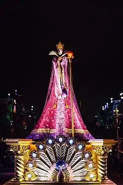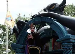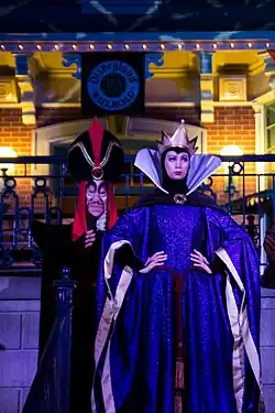 In the Disney Villains Mix and Mingle and Mickey's Boo-to-You Halloween Parade shows during Magic Kingdom's Mickey's Not-So-Scary Halloween Party, the Queen is one of the villains led by Maleficent that appear during the Cinderella Castle Forecourt Stage.[79][80] Susanne Blakeslee voiced the Queen at 2001's Share A Dream Come True Parade, where she could be seen transform herself into a hag.[81] The Evil Queen is one of the "favourite" villains included in Magic Kingdom Park's special pre-parade procession "It's Good to be Bad" a night before the annual Main Street Electrical Parade.[82] One event featured a giant interactive mirror and included the Queen and two other "Divas of Evil", Maleficent and Cruella de Vil.[83] She also prominently appears at Villains Unleashed party,[84][85] a separately ticketed event at Disney's Hollywood Studios that was introduced in 2014.[86]