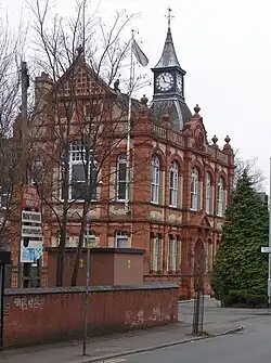 Withington was anciently a township and chapelry within the parish of Manchester[25] and hundred of Salford. In 1866 Withington became a separate civil parish. Following the Public Health Act 1875, Withington Town Hall was built in 1881 on Lapwing Lane, originally to house Withington Local Board of Health, then later occupied by the Withington Urban District Council, formed under the Local Government Act 1894. In 1904 the urban district was abolished[26] and Withington became part of the County Borough of Manchester.[3][4] The old Town Hall building has been converted into private apartments with new-build apartments to the south (back) and east (side). On 1 October 1933 the parish was abolished and merged with South Manchester.[27] In 1901 the parish had a population of 16,050.[28]