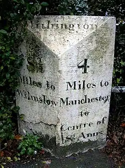 - Milestone, Wilmslow Road – outside the fire station, inscribed "8¼ miles to Wilmslow / 4 miles to Manchester to centre of St. Ann's"