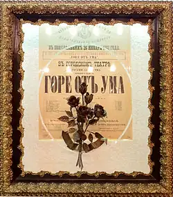 The play, written in 1823 in the countryside and in Tiflis, was not passed by the censors for the stage, and only portions of it were allowed to appear in an almanac for 1825. But it was read out by the author to "all Moscow" and to "all Petersburg" and circulated in innumerable copies, so it was as good as published in 1825; it was not, however, actually published until 1833, after the author's death, with significant cuts, and was not published in full until 1861.[4] The play was a compulsory work in Russian literature lessons in Soviet schools, and is still considered a golden classic in modern Russia and other minority Russian-speaking countries.