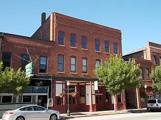 The building is three stories and constructed of brick in a restrained Italianate style.[3] Its foundation is likely constructed of stone.[5] There is a two-story structure attached to the rear. The brick portion of the building is rectangular in shape with a flat roof. The façade is divided into three parts: the storefront, the upper wall, and the cornice. The building retains its original dual entrances, which were not always recessed, and the exposed steel beam that separates the storefront from the top two stories. The windows on the upper floors are organized in two sets of three on both floors. It emphasizes the two sides of the building. Each window features a segmentally arched header and a stone sill. The cornice is composed of patterned brickwork.