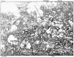 On June 3, 1653 Wohlenschwil was the site of the Battle of Wohlenschwil, which ended the Swiss peasant war of 1653. Despite a peace treaty which had been signed between the peasants and the city of Bern, on May 30, 1653, Zürich assembled an army under the command of Conrad Werdmüller with the task to break any armed resistance once and for all times. Some 8,000 men with 800 horses and 18 cannons[3][4] marched towards the Aargau. Already three days later, Werdmüller's army controlled the important crossing of the river Reuss at Mellingen. In the hills around the nearby villages of Wohlenschwil and Othmarsingen a peasant army of some 24,000 men[5] assembled, led by Leuenberger and Schybi. A peasant delegation tried to negotiate with Werdmüller, showing him the peace treaty concluded with Bern. Werdmüller, who had been until then unaware of this treaty that had been signed only days before, refused to acknowledge the validity of the contract and demanded the unconditional surrender of the peasants.[6][7] Thus rebutted, the peasants attacked Werdmüller's troops on June 3, 1653, but being poorly equipped and lacking any artillery, they were defeated decisively in the Battle of Wohlenschwil. The peasants were forced to agree to the peace of Mellingen, which annulled the Huttwil League. The peasant troops returned home and an amnesty was declared, except for the leaders of the movement.