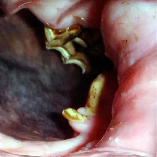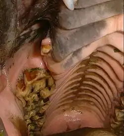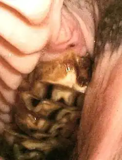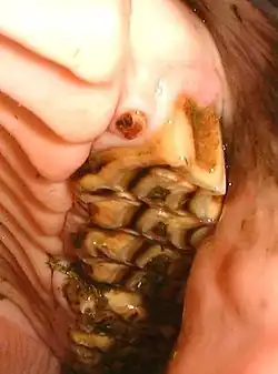 Wolf teeth are small, peg-like horse teeth, which sit just in front of (or rostral to) the first cheek teeth of horses and other equids. They are vestigial first premolars,[1] and the first cheek tooth is referred to as the second premolar even when wolf teeth are not present. Torbjörn Lundström in Sweden reported that about 45-50% of 25000 horses had wolf teeth. They are much less common in the mandible (lower jaw) than the maxilla (upper jaw) although mandibular wolf teeth are found very occasionally.