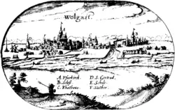 ![]() The Castle (right) on an early 17th-century view of the city, part of the Map of Lubinus | |