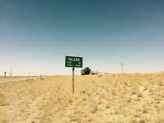 Hiland is so named because it was the highest point on the Wyoming portion of the Chicago and North Western Railway.[5] Originally established as Woolton, the community later adopted the spelling Wolton before being renamed Hiland in 1914. The name change followed the relocation of most residents to Arminto, the new nearby railhead. As of 2016, the town consisted of a general store with an attached bar popular with bikers, an adjacent house, and a small motel with a row of rooms. About 200 yards from the buildings, there is a small cemetery where Hiland's earliest residents are buried.