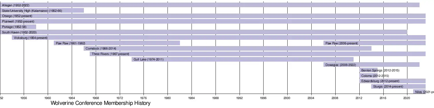 The Wolverine Conference was formed in 1952, consisting of Allegan, Western State High (Kalamazoo), Otsego, Plainwell, Portage, and South Haven.[3] Five boys sports were sponsored by the league that first year: football, basketball, baseball, tennis and track. Girls sports were added in the 1973-74 year with basketball, tennis, softball and track being the sponsored sports. Portage left for the SMAC in 1958. The Wolverine expanded for the first time in 1954, adding Vicksburg to the conference. The Wolverine "B" Conference has always consisted of mostly Class B high schools, but there are bylaws in case a school is Class A for more than two years. In that instance, over 75% of schools must approve said school's membership and the school's case is reviewed every year.[4]