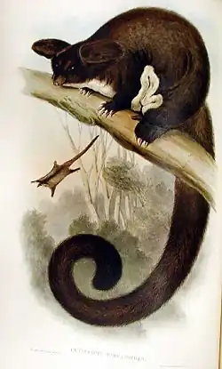 The native fauna consists of marsupials and monotremes, reptiles, amphibians, bats and birds.[17] The greater glider (Petauroides volans) is the largest possum found in this forest. It has furry hair with the colour varying from grey to cream and with a pale underside. It has a large snout and large ears. Its range is in the western part of the Wombat State Forest.[18] Several state-listed threatened bird species occur in the forest including the great egret, intermediate egret, grey goshawk, Australian masked owl, powerful owl and square-tailed kite. Additionally, the forest is the western extent of the range of the red-browed treecreeper and olive whistler.[19][20]