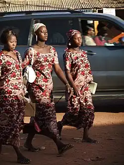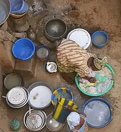 Education is compulsory from ages six to 15. However, many children do not attend school, and girls' enrollment is lower than that of boys at all levels due to factors such as poverty, societal preference to educate boys, child marriage and sexual harassment.[9] In Malian households, the sons help with family farms, enterprises, and market purchases. They are in charge of all the major decision-making. Malian men are expected to acquire resources and earn the family income.[10] The daughters quickly begin doing domestic chores and caring for younger siblings. Women are expected to handle the household chores and tend to garden plots. In polygamous households, women share and split up their tasks.[10]