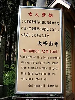 The Japanese government issued an edict (May 4, 1872, Grand Council of State Edict 98) stating, "Any remaining practices of female exclusion on shrine and temple lands shall be immediately abolished, and mountain climbing for the purpose of worship, etc., shall be permitted". However, exclusionary practices remain in some places.[10] For example, a sign at a World Heritage site associated with Shintoism, Mt. Omine in Nara, forbids women from climbing to the top, which has triggered a number of controversial protests.[11] Some Shinto shrines also ask recent mothers not to pass through torii gates when entering for 72 days after childbirth.[11] Also, women in Japan were forbidden from participation in Yamakasa, parades in which Shinto shrines are carried through a town, until 2001.[11]