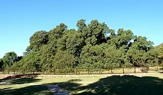 The Wonderboom (Afrikaans: 'wonder tree') is a dense grove of parent and daughter trees of the species Ficus salicifolia, that descended from a central bole of about a thousand years old.[1][2] It is situated in the Wonderboom Nature Reserve, Pretoria, and two circular walkways currently protect it from pedestrian traffic around its trunk and roots. As it has grown, its outlying branches have rooted themselves around the parent tree. This has repeated until there are now three layers of daughter trees encircling the mother fig, with 13 distinct trunks, covering an area with a diameter of over 50 metres (160 ft).