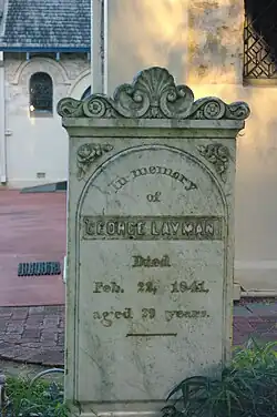 In 1827 George Layman, then 17 years old, immigrated to Australia from England and settled in Van Diemen's Land, Tasmania, with his brother Charles. Van Diemen's Land was initially a penal colony, but became a colony in its own right in 1824. In 1829, Layman was attacked and robbed of all his money by escaped convicts, and decided to work his passage to the new Swan River Colony, arriving in October 1829. He married Mary Ann Bayliss in Perth in 1832; the couple established a homestead in Augusta. However, Augusta failed as a settlement, and many of the settlers chose to exchange their grants there for land in the Vasse region.[1]