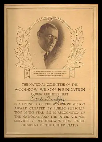 - ^ United Press International, "Will Organize 'Woodrow Wilson Foundation': Income Will Be Devoted to Awards for Greatest Accomplishments in Aid of Humanity," Dunkirk [NY] Evening Observer, Aug. 5, 1921, pg. 1.