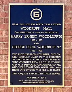 Woodruff Hall was a 3,000 seat multi-purpose arena on the University of Georgia campus in Athens, Georgia. It opened in 1923, and was located on North Campus in the area bounded by Baldwin Street, Sanford Drive, and Hooper Street now occupied by the Psychology-Journalism Complex. The building was named for George Cecil Woodruff and his brother Harry, both of whom were football players, with the former becoming coach in the mid-1920s. The building featured a gabled wood roof, many windows, and wrap around bleachers and a balcony.[1] It was home to the University of Georgia Bulldogs' basketball team until it was replaced when Georgia Coliseum opened in 1964.[2] The Hall was one of the buildings that was used for the training of servicemen in the Second World War.[3]