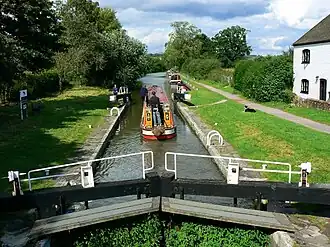 Jessop's suggestion was implemented, and the change in level required four locks at the western end, with the canal rising through Wootton Rivers Bottom Lock, Heathy Close Lock, Brimslade Lock and Wootton Top Lock, all in the parish of Wootton Rivers,[8] as well as most of the Crofton Locks at the eastern end. Crofton Pumping Station supplied water from local springs to the summit level,[9] but more water was needed, and an 8-acre (3.2 ha) reservoir known as Wilton Water was constructed in 1836 by damming the nearby River Dun, from which additional supplies could be drawn. The work was carried out by John Blackwell.[10]