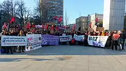These structures give Workers' Initiative the ability to organise workplaces that larger union confederations have struggled to enter, including non-governmental organisations and the logistics industry.[27] Temporary workers, including self-employed artists, have been offered individual membership by the OZZIP.[34] The OZZIP has also sought to establish links with the wider left-wing social movement in Poland.[35] It has formed links with anti-eviction groups and tenants unions, as well as the broader Polish anarchist and feminist movements.[4]