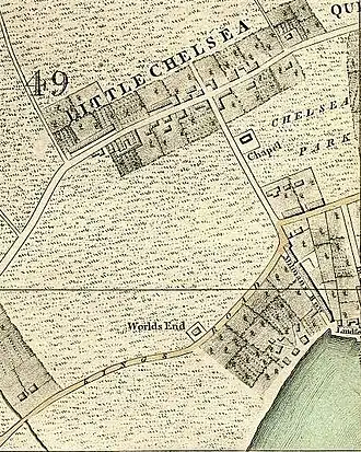 In the King's Road, near Milman Street, is an inn styled "The World's End." The old tavern... was a noted house of entertainment in the reign of Charles II. The tea-gardens and grounds were extensive, and elegantly fitted up for the reception of company. The house was probably called "The World's End" on account of its then considerable distance from London, and the bad and dangerous state of the roads and pathways leading to it. (Old and New London, 1878)[1]