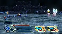 The game's battle system makes use of the Active Time Battle (ATB) system employed by multiple Final Fantasy games. In battle, players control a party of Mirages which can be stacked upon each other to grant various boons in battle while decreasing the number of turns that can be taken. The party can attack freely, use items, and perform abilities using Action Points (AP).[7][8] The types of Mirages used affect the party's available skills and abilities in battle. Mirages are captured in battle after they have been sufficiently weakened or a particular sequence of actions is taken, and once in the party can be freely named. In addition to standard Mirages are special Mirages that can be temporarily summoned into battle using a full pool of AP: the Mirage remains in battle, replacing the main party, until either the summoner's AP is depleted or the Mirage's health drops to zero.[8][3][9]
