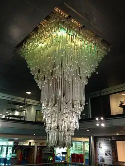 Since 2008 the World of Glass has been home to one of four chandeliers, restored by David Malik & Son, which originally hung in the main hall of Manchester Airport.[17] With 1,300 clear, smoked grey and amethyst lead glass droplets, individually blown by master craftsman Bruno Zanetti and weighing two tons, each chandelier was commissioned at a cost of £3,000 in the 1960s but would now cost more than £250,000.[18]