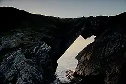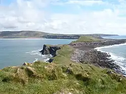 Worm's Head (Welsh: Pen Pyrod) is a headland, at Rhossili, part of the City and County of Swansea, Wales. It is the furthest westerly point of the Gower Peninsula. The name Worm's Head is derived from an Old English word 'wyrm' for 'sea serpent'.[1] The headland of carboniferous limestone comprises three islands: the Inner Head, the Middle Head which features a collapsed sea cave which is known as the Devil's Bridge, and the Outer Head.[2] In total, it is approximately one mile long. The Inner Head is up to 200 yards wide.[3] Worm's Head is only accessible on foot for 2+1⁄2 hours either side of low tide, fatal to attempt to wade or swim to when the causeway from the mainland is flooded.[4]