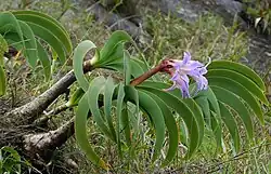 Worsleya is a genus of Brazilian plants in the amaryllis family Amaryllidaceae, cultivated as an ornamental because of its showy, pale violet flowers, often with a yellow stripe down the middle of each tepal. There is only one known species, Worsleya procera, native to eastern Brazil.[6][7][8] It is endemic to the mountains around Petrópolis, about 40–50 km (25–31 mi) north of Rio de Janeiro.[9] Here the sickle-shaped leaves curve northward. When grown in the northern hemisphere, the leaves curve southward.[10] It has one of the largest bulbs, around 1.5 m (4 ft 11 in) high by up to 30 cm (12 in) thick near the base)[11] and also rarest members of the subfamily Amaryllidoideae (family Amaryllidaceae).