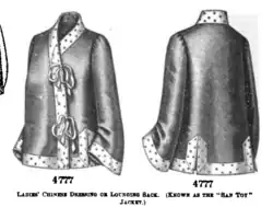 European clothing with wrap-style closure were heavily influenced by the popularity of Orientalism in the 19th century.[2][note 4] In the 20th century, Chinoiserie in fashion gained popularity and impacted many fashion designers of the time, including fashion designed based in the United States. According to the Ladies’ Home Journal of June 1913, volume 30, issue 6: