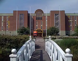 The Wrexham Industrial Estate had its origins as a Royal Ordnance Factory, ROF Wrexham, during World War II. The site employed 13,000 workers.[2] The factory made cordite, an explosive propellant for shells.[3] The site was chosen for its distance from German bomber bases in Europe while having good rail networks and a rural location that provided a good supply of labour. The complex was spread over a large area to minimise any damage from aerial attack. The main buildings were camouflaged and existing farm buildings were left in situ to help protect the site against reconnaissance. Many of the original buildings can still be seen today and still house smaller businesses on the estate; these can be distinguished from the 1950s buildings by large grids near the roof, essential for ventilation of the buildings.