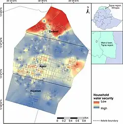Water in Wukro has been a scarce resource due to urban population growth, construction, and the seasonality of water availability.[22] Climate variability is a driver of water access in Wukro, with greater access to water during the wet season, particularly July to September. In the dry season, around 43%–45% of households rely solely on piped water to meet domestic water needs, which is mostly supplemented with buying water. In the wet season, just over half of households rely on piped water only for drinking and cooking, while rainwater is used widely for washing clothes, cleaning and bathing; a smaller proportion of households still rely on bought water for drinking and cooking.[23]