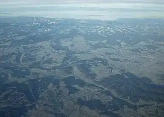From the direction of the Feldberg to the Blumberg Gate (Blumberger Pforte, centre) the Wutach crosses the open South Baar countryside in a long forested gorge. From here it flows to the left through the Wutachflühen to the Rhine, whereas its former valley, 165 metres higher, continues to the right and runs down to the Danube. | |