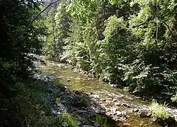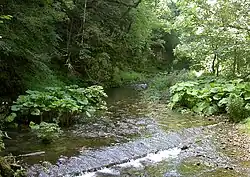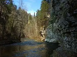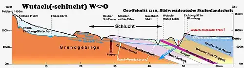The Wutach Gorge (German: Wutachschlucht) is a narrow, steep-sided valley in southern Germany through in the upper reaches of the River Wutach with three gorge-like sections, the lowest of which is also called the Wutachflühen. The gorge cuts through the southern part of the Baar region from the eastern side of the High Black Forest heading eastwards to the Trauf the steep, northwestern flank of the Swabian Jura, which transitions to the Randen mountains here.
