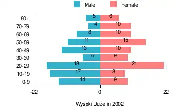 According to the 2002 Poland census, there were 194 people residing in Wysoki Duże village, of whom 49,5% were male and 50,5% were female. In the village, the population was spread out, with 21,6% under the age of 18, 34,0% from 18 to 44, 25,3% from 45 to 64, and 19,1% who were 65 years of age or older.[1]