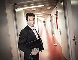 Xabier Anduaga was born in 1995 in San Sebastián, Spain and studied at the Musikene College of Music.[2] In 2016 he participated in the Accademia Rossiniana in Pesaro where he appeared in the featured role of Cavalier Belfiore in Rossini's opera Il viaggio a Reims.[2] He made his professional debut in staged opera at the Teatro Arriaga, Bilbao as the Prince in Rossini's La Cenerentola in 2016.[3] He subsequently appeared in Rossini's Le siège de Corinthe and other roles at the Rossini Opera Festival[2] Anduaga has performed the leading role of the Conte Almaviva in Il Barbiere di Siviglia of Rossini in St. Petersburg, Rouen, Beijing, Parma, Paris and Naples.[2] On April 14, 2023, Anduaga made his house debut at the Metropolitan Opera as Nemorino in L'Elisir d'Amore