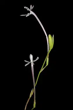 Its leaves are ovate and grow flat on the ground, while its flowers grow directly upwards. Its flowers are small and tubular, with its stem generally growing anywhere from three to twenty centimeters in length. They normally have white petals, but it is possible for them to be a pale pink color.[5][6] Their fragrance is described as "spicy-sweet".[6]