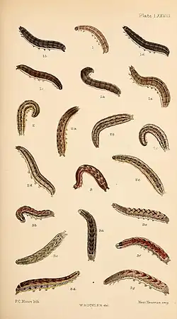 Larva polyphagous, brown or grey, with a red tinge; the lines pale; a row of oblique dark sublateral bars; a pale bar on segment 12; head pale brown. The larvae feed on Myrica gale, Rubus species and other plants and trees.[6]