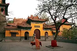 Under the eaves of the Shanmen is a plaque with the Chinese characters "Xingguo Chan Temple" written by former Venerable Master of the Buddhist Association of China Zhao Puchu. In front of the hall, a wooden plaque with a couplet is hung on the two side pillars. It says "暮鼓晨钟,惊醒世间名利客;经声佛号,唤回苦海梦迷人". It was composed and inscribed by Qing dynasty scholar Yang Zhaoqing (杨兆庆).[2]