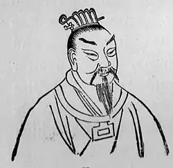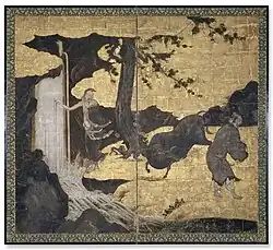 Xu You denounced the society and retreated to the north of Ying River.[1] Living a simple life, he scooped river water with his bare hands, even though he had a hulu (an ancient water bottle shaped like a gourd).[2] Xu was a disciple of the female teacher Gnaw Gap,[3] whom Xu described as "[blending] a myriad things [...] senior to high antiquity but is not aged".[4] The legendary ruler Emperor Yao regarded Xu with utmost respect and requested that he be his teacher. They shared a positive relationship. Towards the end of Yao's rule (traditionally believed to be circa 2256 BC),[5] the ruler chose Xu as his successor.[6] (Much later, the Chinese sage Confucius greatly lauded Yao's decision to appoint Xu as the next emperor in line.[7]) However, Xu refused to accept the throne, commenting that he had "no need for all under heaven".[8] Legend goes on to state that an abashed Xu "washed out" his ears' contents into the Ying River, contaminating it.[9] After Xu died, he was apparently buried at the summit of Mount Chi. The Han Dynasty "Grand Historian" Sima Qian mentioned Xu in a chapter of his work Records of the Grand Historian. Sima personally visited the alleged grave of Xu and wrote that Xu was an epitome of "highest virtue".[10] Xu You is also depicted in a seventeenth-century Japanese artwork titled Xu You and Chao Fu, illustrating the popular tale of another fellow hermit detouring from the Ying River because of the filth Xu had contributed to it by washing out his ears there. It is now housed at the British Museum.[11]