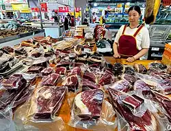 Xuanwei ham (Chinese: 宣威火腿; pinyin: Xuānwēi huǒtuǐ) is a dry-cured ham in Qujing Prefecture of Yunnan province, China.[1][2] Xuanwei ham has a 250-year history dating back to 1766. In 1909 it was first mass-produced and gained popularity. In 1915 Xuanwei ham won a gold medal at Panama International Fair. Xuanwei ham enjoys a high reputation both internationally and locally.[1] The ham is "rose-red" in color and similarly shaped to a pipa.[3]