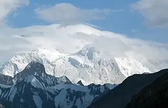 Xuelian Feng (Chinese: 雪莲峰), also spelled Xuelian Peak or Snow Lotus Peak,[3] is one of the major mountains of the Tian Shan mountain range. It lies in Xinjiang province, China, about 50 kilometres (30 mi) east-northeast of Jengish Chokusu, the highest peak in the range. It is notable for its large, steep relief above the nearby valleys, and for its large topographic prominence. (It ranks 84th by this measure). However, its height is not on List of highest mountains on Earth. The mountain has five summits, with the main being the north summit at 6,627 m (21,742 ft); the south summit has an elevation of 6,527 m (21,414 ft).
