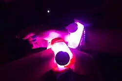 The wristbands themselves are constructed of a thick fabric or biodegradable plastic with LEDs inside the material. A radio receiver is located within a plastic case on the band, and it receives wireless signals from a controller. These signals are sent either by a handheld TV remote styled controller, which has a range of 250 meters, or a controller which is hosted on a laptop computer linked to a radio transmitter,[3] which can remotely control the wristbands from up to 300 meters away.[4] The operator of the controller or laptop software may program all wristbands or only those of certain colors to flash on and off at specific intervals and specific moments. The wristbands are not intended to be lit outside of the concert venue and have a low battery life, although there exist anecdotes of Xylobands "coming back to life" at seemingly random times.[5]