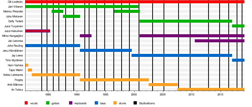 | Past members | Olli Lindholm (deceased) Jussi Hakulinen (deceased) Jesu Hämäläinen Veikko Lehtiranta Juha Mielonen Antti Mäkinen Jukka Mänty-Sorvari Markku Petander Juha Rauäng Jukka Lewis Daffy Terävä Mikko Kangasjärvi Ari Toikka Jari Latomaa Harri Varhala Jani Viitanen Tapio Wallin |