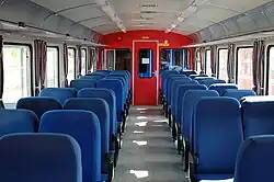 In motor cars, a baggage area behind the cab houses electrical equipment, a sink, a conductor's seat and table, bike racks, and a wheelchair tie-down space, accessed via double inward-opening doors.[2] This leads to a passenger compartment with seats along the sides and a central aisle, overhead luggage racks, an optional toilet with a single door, and an entry vestibule with folding doors over steps.[2]