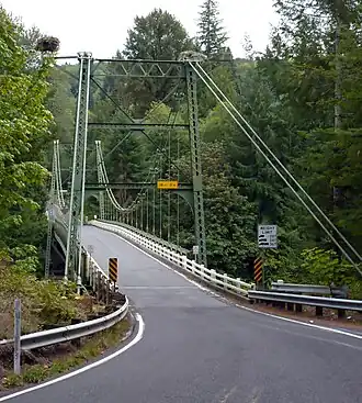 The Yale Bridge or Lewis River Bridge spans the Lewis River near Yale, Washington. It was built in 1932 by Cowlitz and Clark counties. The suspension bridge has a clear span of 300 feet (91 m), with a total length of 532 feet (162 m), replacing a previous steel truss bridge at the site. Construction of the Ariel Dam had created Lake Merwin with a water depth of 90 feet (27 m) at the site, requiring a new bridge that did not need to have support piers in the water. The road deck, stiffened by a steel Warren truss, is 50 feet (15 m) above the high water line of the reservoir.[2][3]