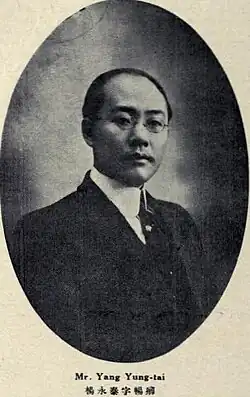 Yang Yongtai (simplified Chinese: 杨永泰; traditional Chinese: 楊永泰; 1880 – October 25, 1936) was a Kuomintang politician of the Republic of China. He was appointed governor of Hubei Province in 1936, but was assassinated the same year.