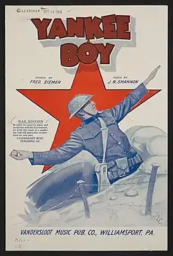 "Yankee Boy" is a World War I song. Lyrics were written by Fred Ziemer, and music was composed by J.R. Shannon.[1] Vandersloot Music Publishing Company produced the song in 1918. On the cover of the sheet music, there is a soldier in a trench, throwing a grenade.[2] The song was written for both voice and piano. The lyrics show support for the soldiers fighting in the war, and how the Yankee Boy will "win both fame and glory."[3]
